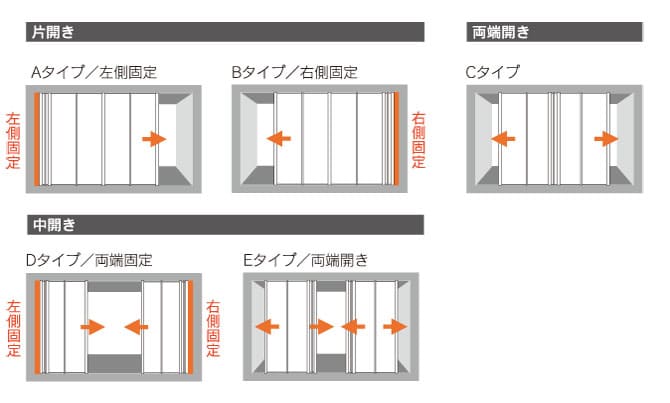 カーテンシャッターアペリアには計5種類の開閉スタイルがあり、片側のみに収納するタイプ(片開き)と両端に収納するタイプ(中開き/両端開き)がございます。